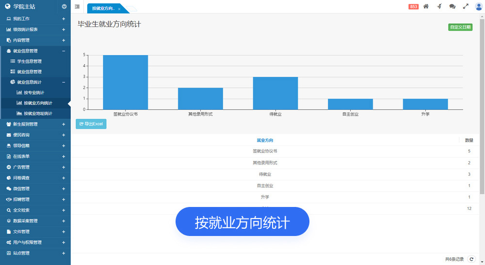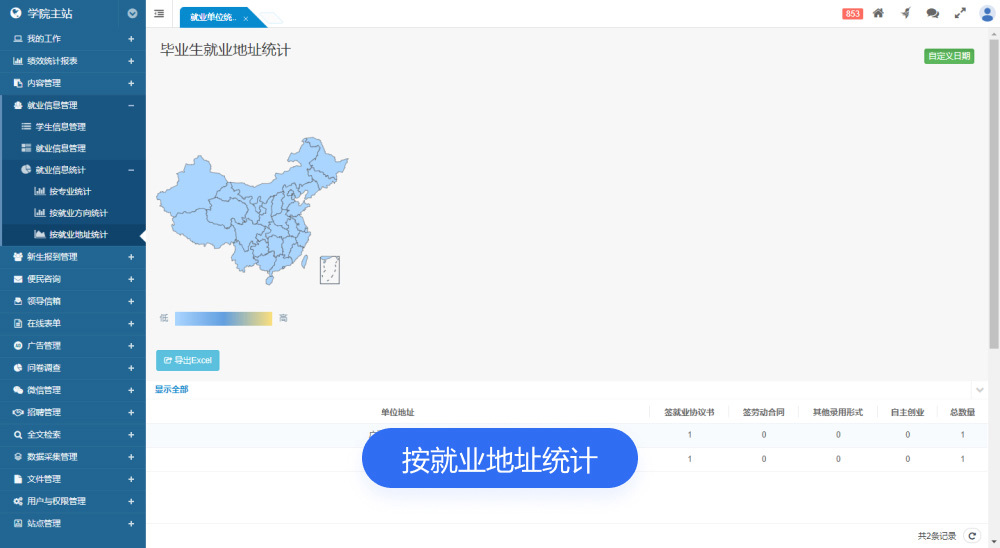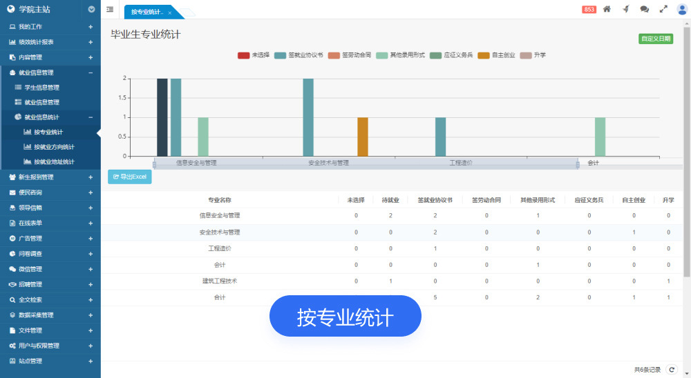 畢業(yè)生就業(yè)信息支持多維度統(tǒng)計(jì):按專業(yè)統(tǒng)計(jì)、按就業(yè)方向統(tǒng)計(jì)、按就業(yè)地址統(tǒng)計(jì)。