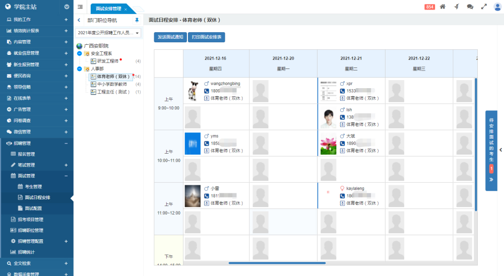 系統(tǒng)的中欄顯示本次招考項目的職位列表,每個職位名稱后標(biāo)注進(jìn)入面試流程的考生總數(shù)。若有“待安排面試時間”的考生,系統(tǒng)會以紅點提示。右側(cè)顯示待安排面試的考生列表,中間則為面試日程安排表。