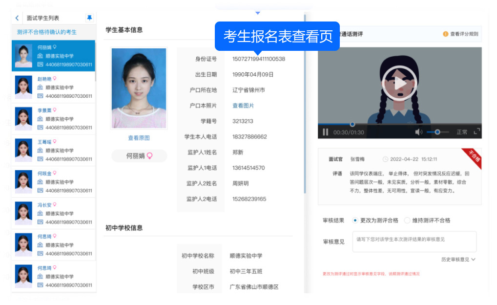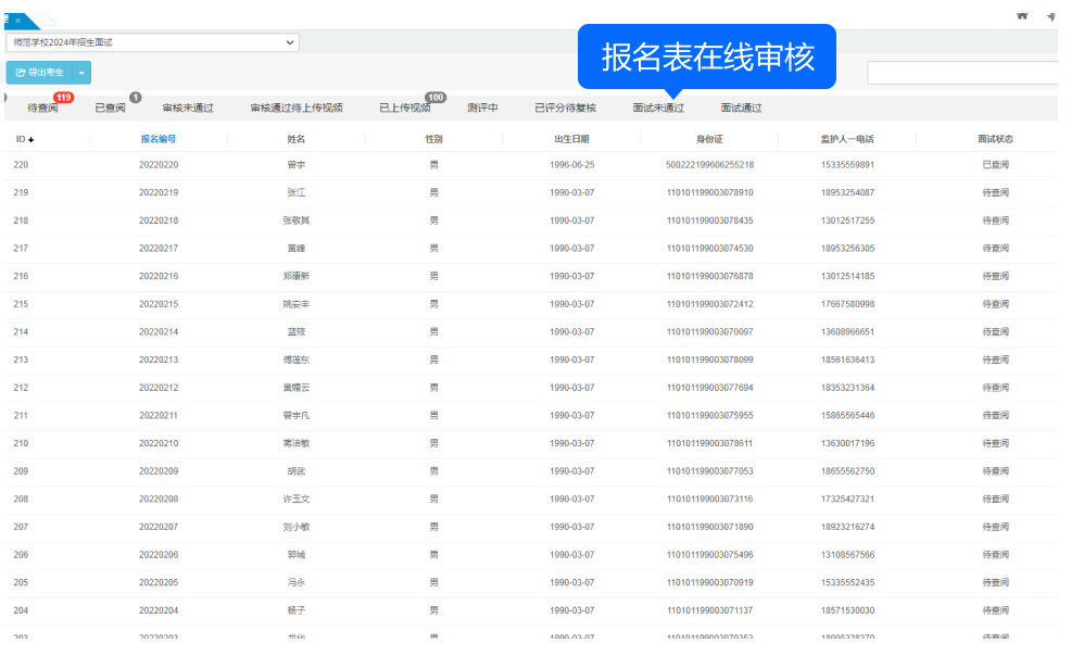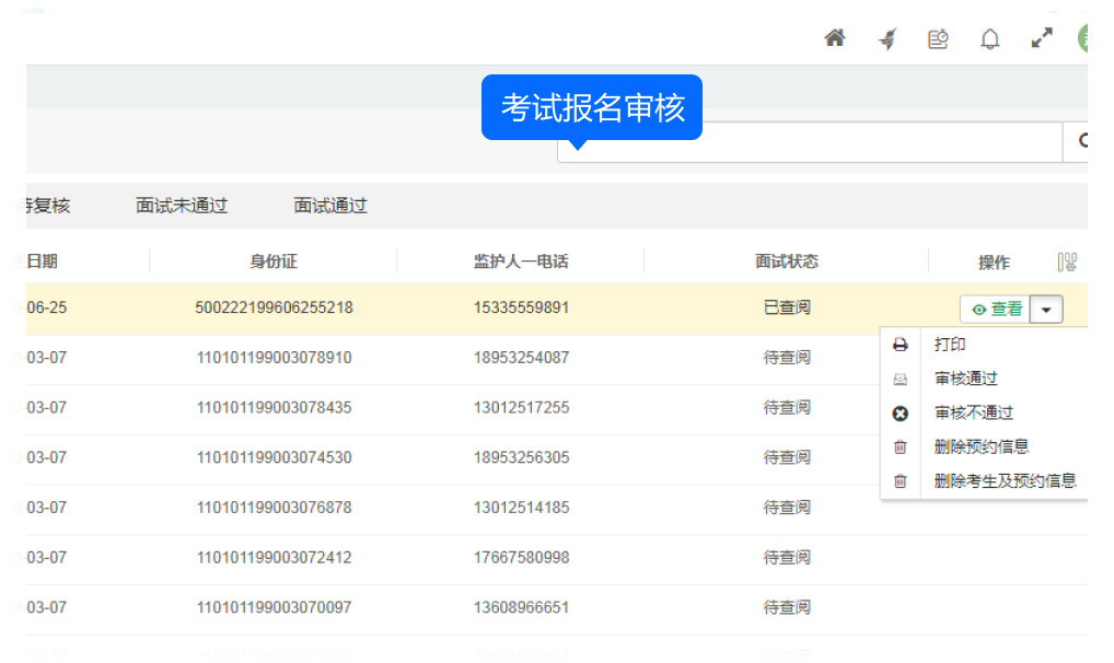 針對報名表的處理提供了豐富的操作選項,包括查看報名表、審核通過、審核不通過、撤消審核不通過、打印報名表、刪除報名信息、刪除考生及報名信息等,并支持這些操作的批量處理,極大地提高了工作效率。查看報名表后自動將狀態(tài)改為“已查閱”。