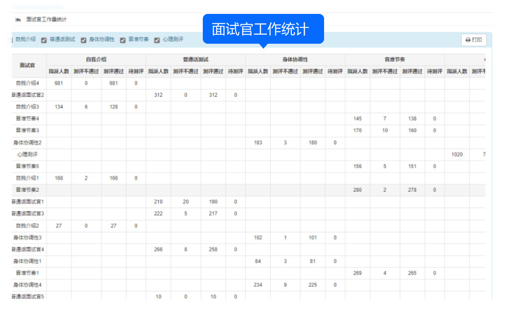 支持招生負責人在評委工作量統(tǒng)計頁面查看每個測評項目中的“已指派、測評不通過、測評通過、待測評”人數(shù),以及每個評委所負責的測評項目的工作量情況。若發(fā)現(xiàn)某評委長時間存在“待測評”的考生,系統(tǒng)可提醒評委及時完成測評,確保流程順利進行。